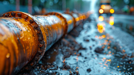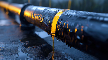 Large industrial pipes are covered in black oil, leaking in a heavy machinery area during the early morning light, creating a stark contrast.