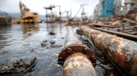 A close-up view of a rusty pipe partially submerged in water at a construction site, highlighting environmental concerns and urban industrial decay.