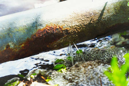 Close-up of waste flowing from industrial pipes into a natural stream, highlighting environmental pollution