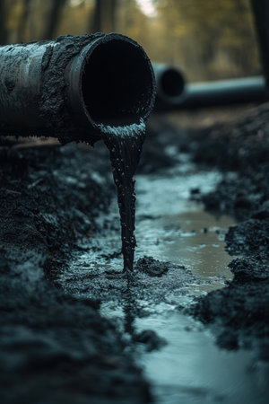 The image captures a pipe discharging muddy water into a natural setting, illustrating the impact of water pollution on the environment with fallen leaves.