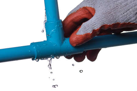 Man's hand holding blue pvc plastic pipe with a broken connection and water pouring out isolated on white background