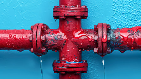 Red industrial valve with water leaking against a blue wall, depicting industrial equipment and maintenance
