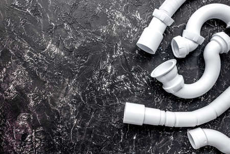 Set of blue PVC pipe fittings isolated on dark background. Blue plastic water pipe. PVC accessories for plumbing. Plumber equipment. Bend and three way connection plastic pipe for water drain sewage.