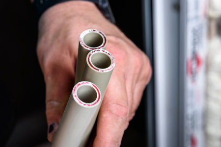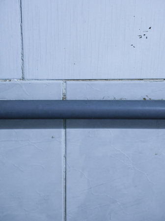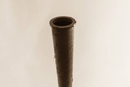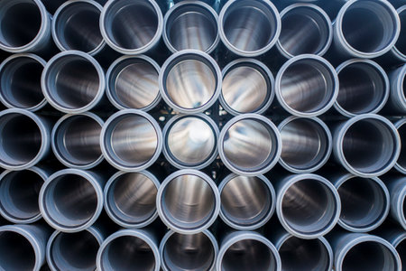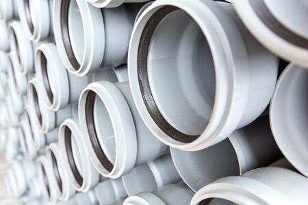 Background of grey plastic sewage pipes used at the building site. Texture and pattern of plastic drainage pipe. Light through tubes.