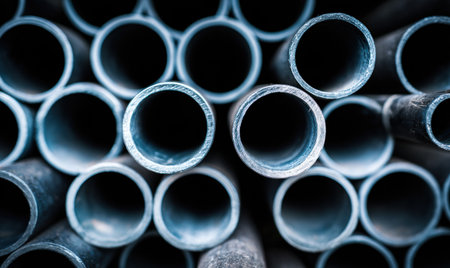 This image captures a close-up view of bundled metal pipes, showcasing their texture and color variations in an industrial environment.