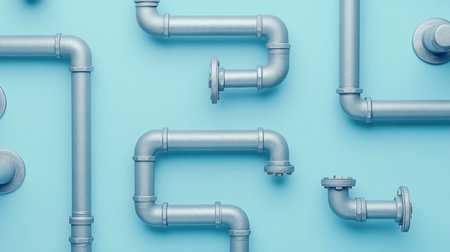 This image features a detailed arrangement of metallic pipes against a vibrant blue background, illustrating industrial design and plumbing elements.