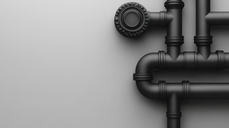 This image showcases an arrangement of black plastic pipes on a vibrant green background, ideal for illustrating plumbing, industrial, or construction themes.