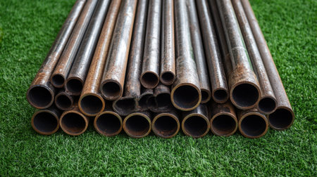 A visually striking composition of rusty steel pipes arranged neatly on a green grass surface, ideal for industrial or construction themed projects.