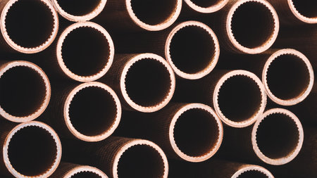 A row of pipes with a brownish color. The pipes are stacked on top of each other. industrial concept background