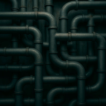 A collection of colorful industrial pipes and fittings arranged artistically against a dark surface, perfect for engineering, construction, or design projects requiring detailed visuals.