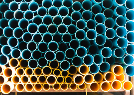 Close up to blue plastic pipe background, PVC pipes stacked in warehouse, PVC water pipes used for construction.
