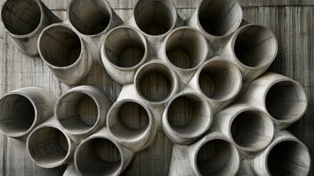 Stacked concrete pipes with visible textures, capturing the raw industrial appeal of building materials under daylight.