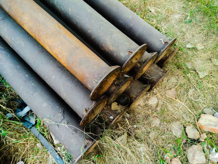 Organized pile of old iron pipes. Old dredger pipes bundle