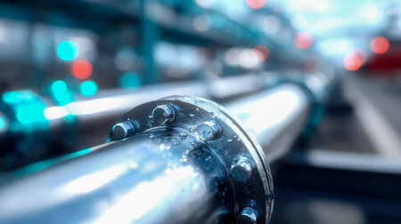 Industrial close-up of wet metal pipes with bolts in a factory environment, surrounded by glowing lights and blur.
