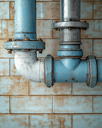 A close-up view of aged metal pipes connects at a cross-junction, showing rust and wear. The textured surfaces reveal a history of use in an industrial environment, emphasizing functionality.
