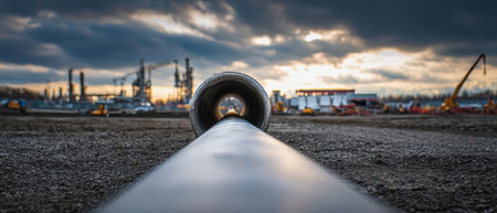 A long metal pipe stretches across the ground amid ongoing construction for a gas station, while machinery works in the background under a dramatic sky.