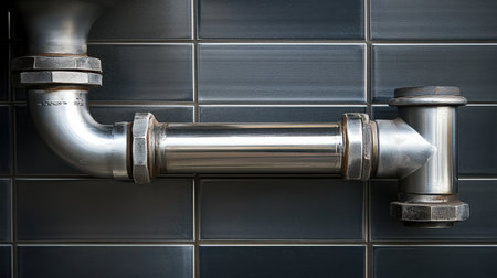 High-resolution image of a stainless steel plumbing pipe system designed with an industrial aesthetic, set against dark tile, ideal for construction or renovation themes.