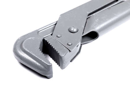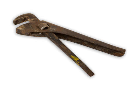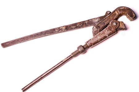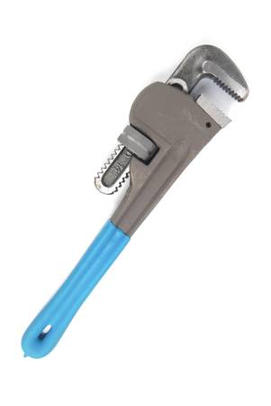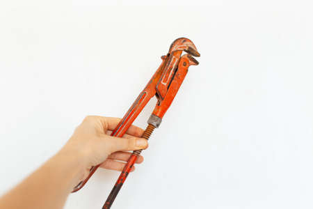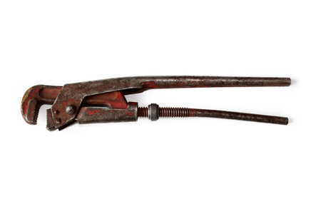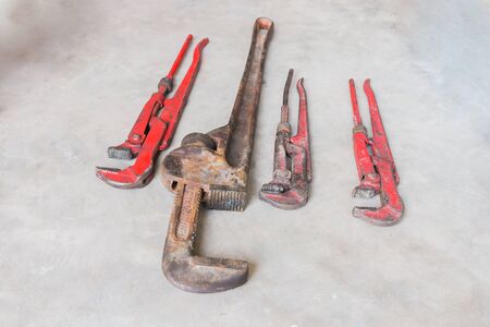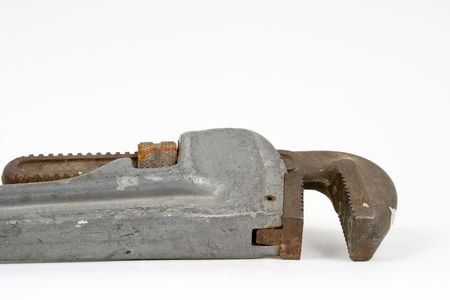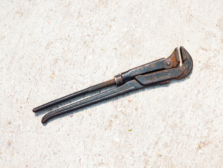 An old beat-up plumber’s wrench which has its red paint partially peeled off