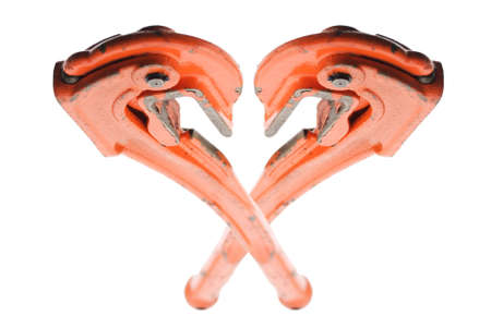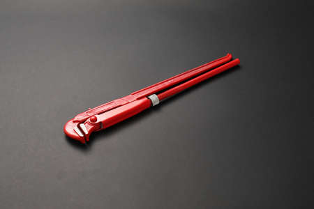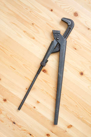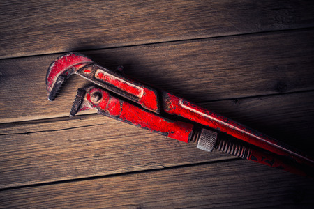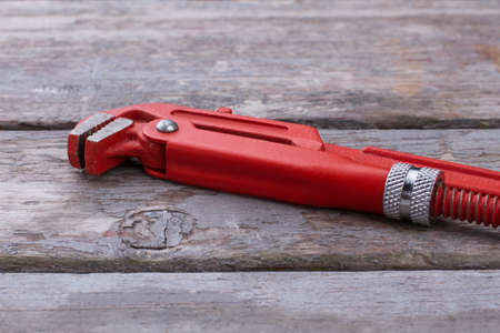 Close-up of adjustable gas wrenches of red color on wooden table.