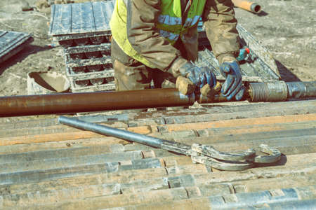 Drilling worker tightens drill pipe on core drilling platform. Made with shallow dof and vintage style.