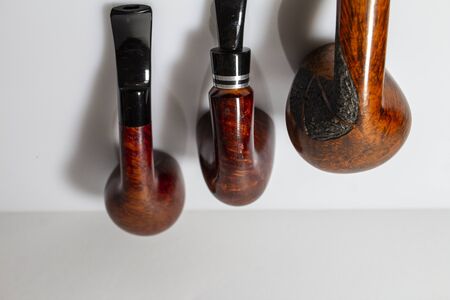 Smoking pipe with tobacco in man mouth close up. Vintage mouthpiece