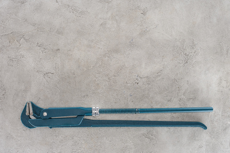 Close-up of adjustable gas wrenches of blue color on wooden table.