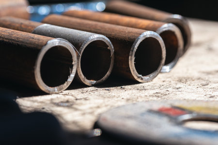 Pipe rammer tool on a fitter workbench. Pipework concept background.