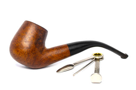 Wooden smoking pipe with tobacco on a yellow background, smoking harms