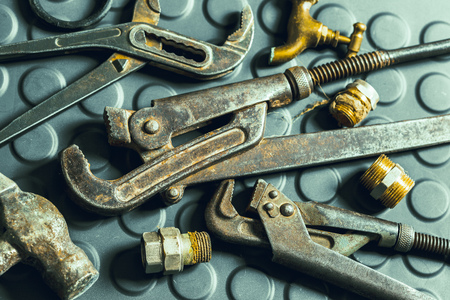 an old rusty wrenches on wooden foreground