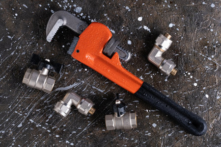 Adjustable pipe wrench and plumbing fittings on grunge background.