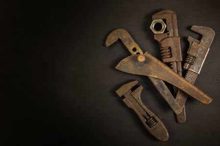 Set of old wrenches on a rusty dark metal background