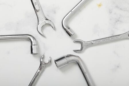 Different wrenches on a metal background
