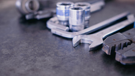 Set of chrome wrenches on steel surface. Mechanic tools for maintenance. Hardware tools to fix. Technical tools background