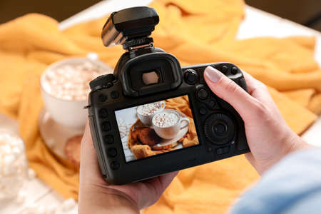 Photography blogging workshop concept. Hand holding camera taking photo of coffee in coffee shop.