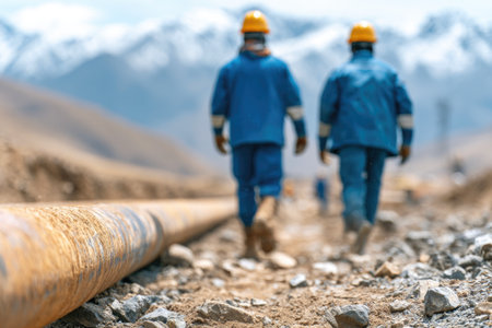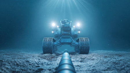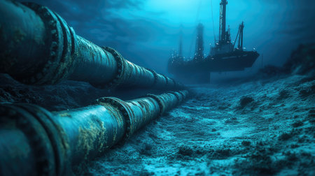 Workers inspecting the undersea gas pipeline: The focus be on the importance of regular maintenance and inspection of the pipeline. Generative AI