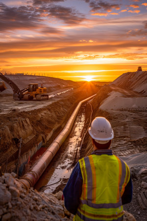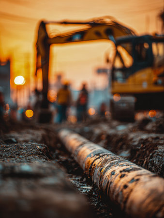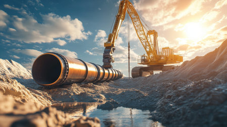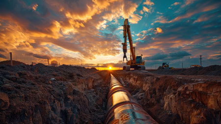 A powerful excavator works diligently on a construction site, moving a large pipeline under a stunning sunset sky, highlighting industrial engineering.