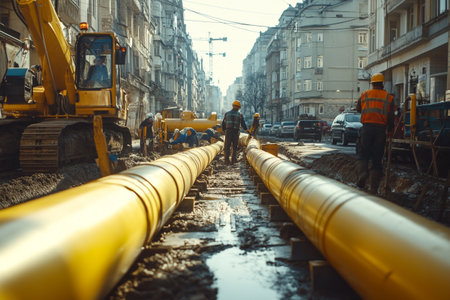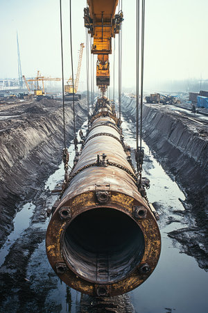 Urban construction scene featuring a massive pipeline being installed amidst bustling city surroundings, powered by heavy-duty machines under a cloudy sky