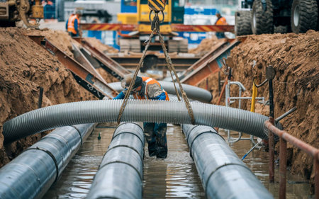 Large industrial pipes being installed, suspended by cranes, in a heavy construction zone