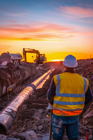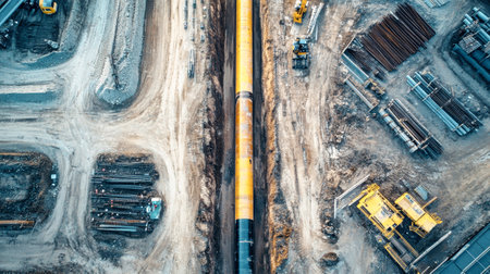 pipeline construction site, capturing heavy machinery, workers, and the laying of pipeline sections.
