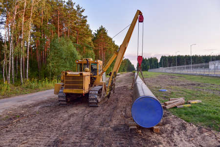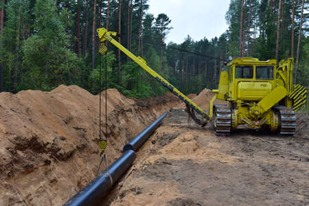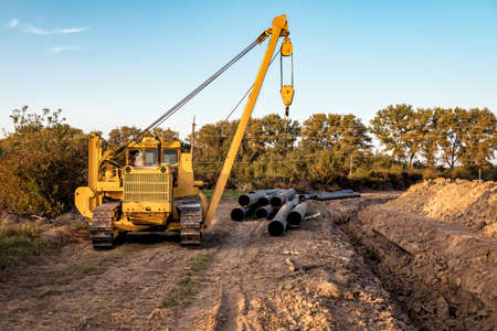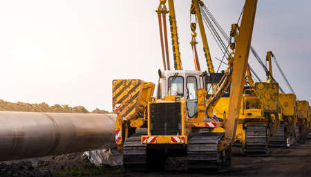 Pipelayer with side boom for Install of natural gas and crude oil pipes in ground. Construction of the gas pipes. Pipeline construction project for global exports to international markets.