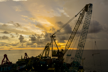 Silhouette of pipelay barge in the middle of South China Sea during sunrise with majestic golden sky background.