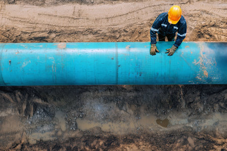 Pipe installation worker. Construction worker installing large diameter water pipe in trench, pipeline construction.