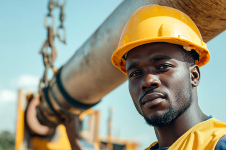 Slinger in helmet unloads metal pipes on construction site on sunny summer day. Real scene. Workflow. Real worker.