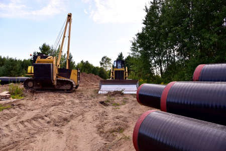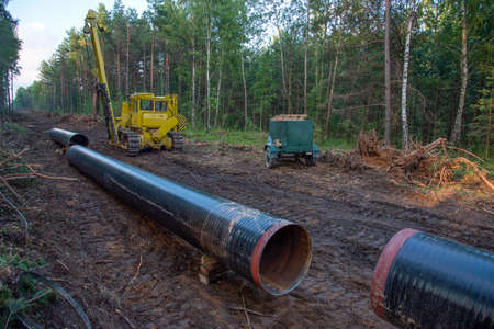Natural gas pipeline construction work in forest area. Installation of gas and crude oil pipes. Construction of gas pipes to new LNG plant.