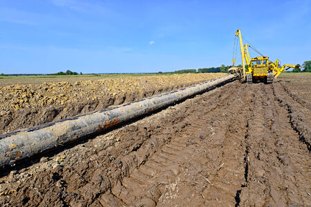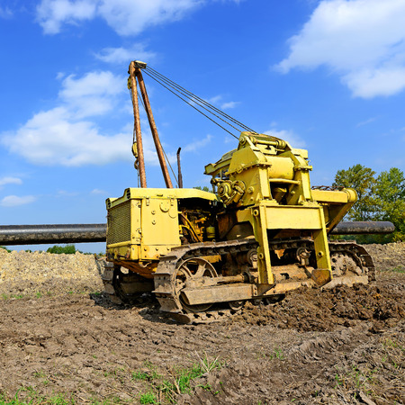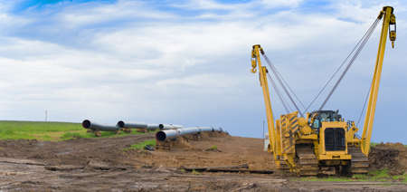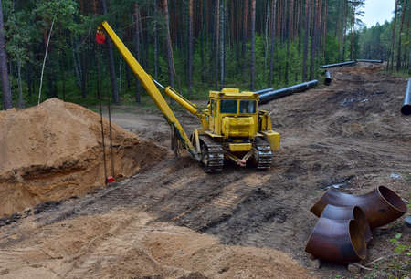 Construction of a new oil pipeline.Machine to twist pipes(pipelaying crane) in a pipeline construction.