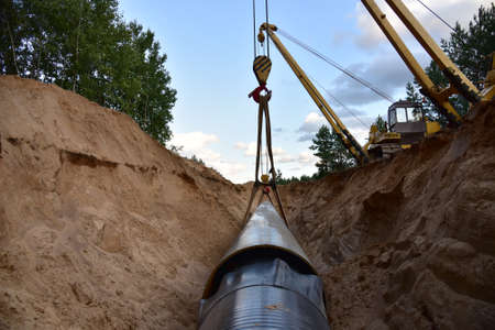 Installation Natural Gas pipeline in tranch. Crude oil pipes Installation for transporting fuel supplies to households and businesses. Crude Oil Pipe Transportation Market.