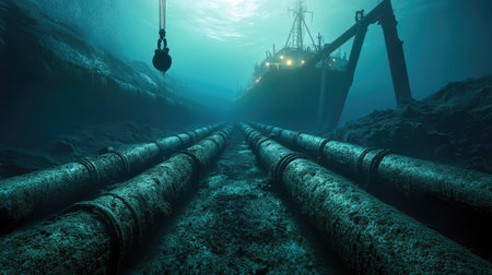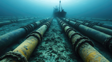 An eerie yet captivating underwater landscape showcasing an abandoned ship and rusting pipelines amidst a serene aquatic environment. The image evokes a sense of mystery and exploration, highlighting the beauty of decay in an underwater world.