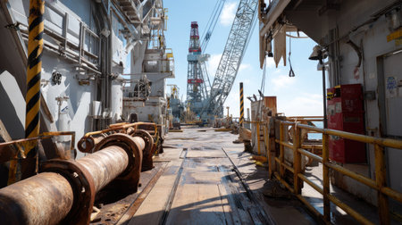 This image showcases the deck of an offshore drilling platform under bright sunlight, highlighting various industrial equipment, pipes, and machinery.