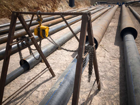 Natural gas pipeline construction work in forest area. Installation of gas and crude oil pipes. Pipe on top of wooden supports at construction site. Construction of gas pipes to new LNG plant