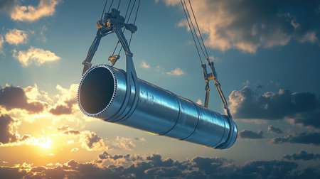A striking image of an industrial crane lifting a large metallic pipe against the backdrop of a colorful sunset, highlighting the power of engineering and construction processes.